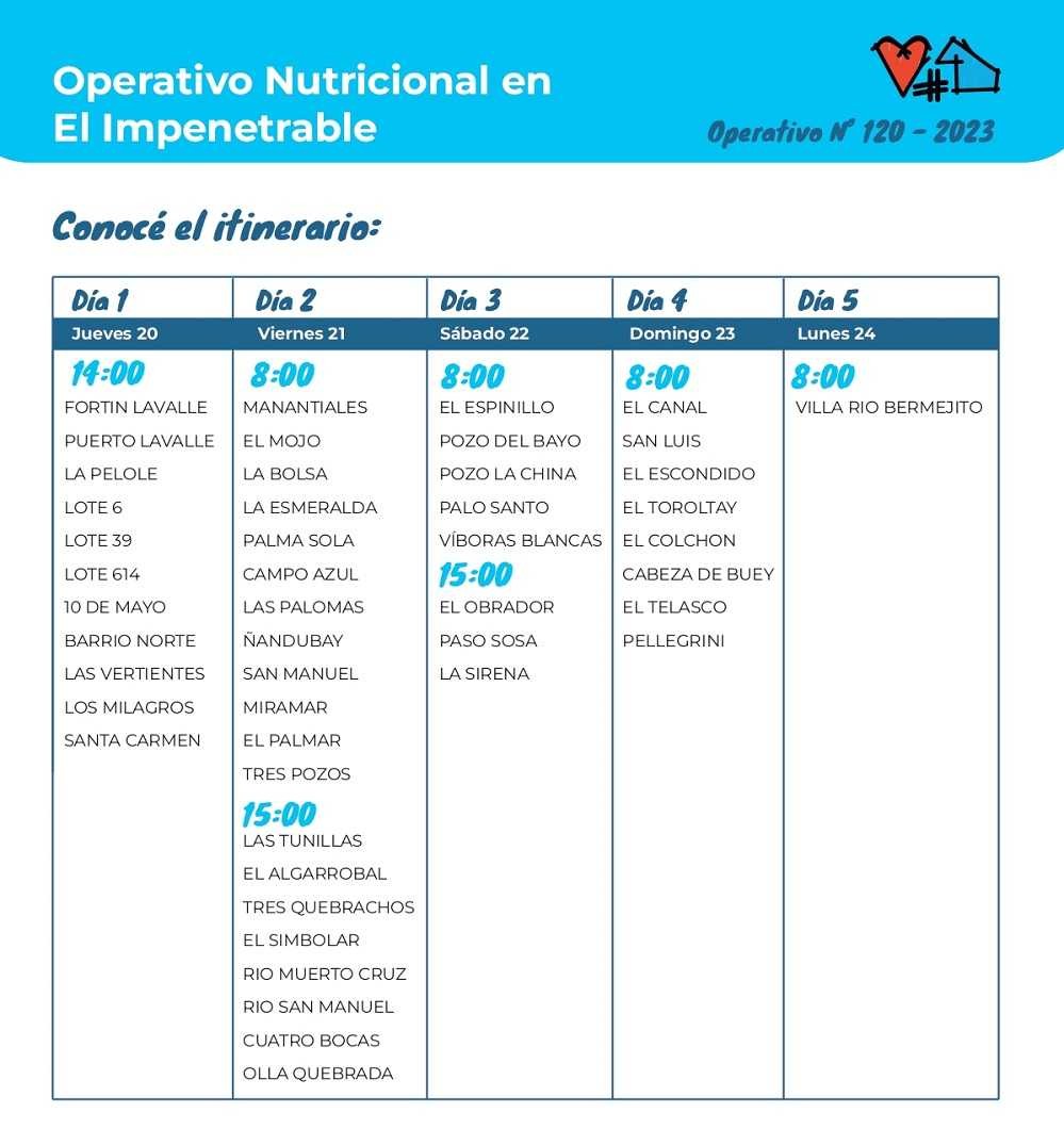 Las entregas alimentarias se realizan a familias que habitan las localidades de El Espinillo y Villa Río Bermejito, y los parajes de: Puerto Lavalle, El Canal, Fortín Lavalle, La Pelole, Lote 6, Lote 39, Lote 614, 10 de Mayo, Barrio Norte, Las Vertientes, Los Milagros, Santa Carmen, Manantiales, El Mojo, La Bolsa, La Esmeralda, Palma Sola, Campo Azul, Las Palomas, Ñandubay, San Manuel, Miramar, El Palmar, Tres Pozos, Las Tunillas, El Algarrobal, Tres Quebrachos, El Simbolar, Río Muerto Cruz, Rio San Manuel, Cuatro Bocas, Olla Quebrada, Pozo del Bayo, Pozo La China, Palo Santo, Víboras Blancas, La Sirena, Paso Sosa, El Obrador, San Luis, El Escondido, El Toroltay, El Colchón, Cabeza de Buey, Pellegrini, El Telasco.