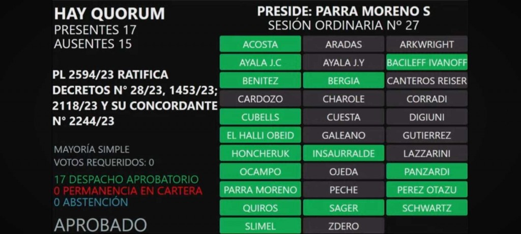Los votos surgieron de los bloques del Frente Chaqueño, del Frente Integrador y del Pro. De esta manera, fueron ratificados los Decretos del Poder Ejecutivo N° 28; N° 1453, N° 2118 y N° 2244 del 2023 -dictados en el marco convenio colectivo de trabajo- y el Decreto N° 2656 que busca regularizar la situación laboral de los agentes vinculados con contratos de Locación de Servicios.