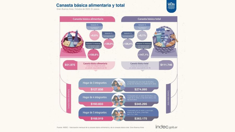 En tanto, el costo de la Canasta Básica Total (CBT) subió 8,1 % en octubre, por lo que el mismo grupo familiar necesitó contar con ingresos por $ 345.295. para no caer debajo de la línea de la pobreza.