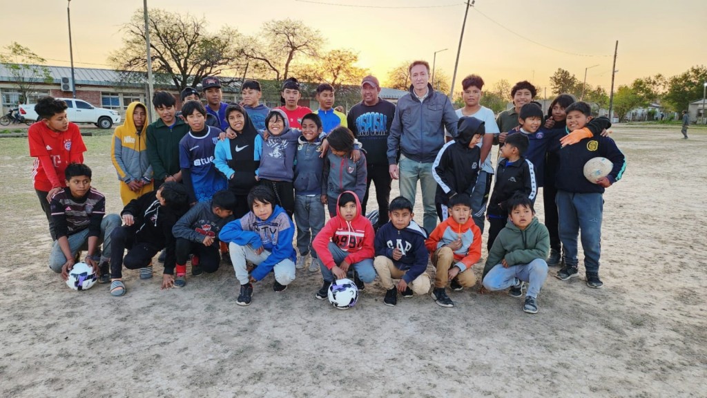Fernando Vogel con los integrantes de la escuela de fútbol del barrio Nocayi.