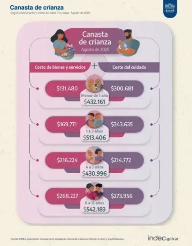 Los hogares necesitaron entre $432.161 y $542.183 en agosto para cubrir los gastos de un niño, según su edad, de acuerdo con la canasta de crianza de la primera infancia, la niñez y la adolescencia (0 a 12 años), según informó el Instituto Nacional de Estadísticas y Censos (INDEC).