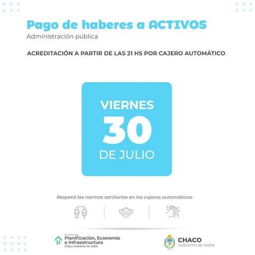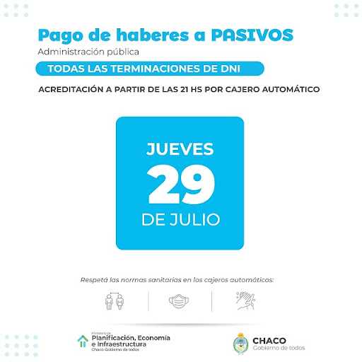 Según informó el Ministerio de Planificación, Economía e Infraestructura, las y los trabajadores pasivos cobrarán primero por cajero automático el jueves 29 y al día siguiente, viernes 30, lo hará el sector en actividad, sin diferenciación de DNI.