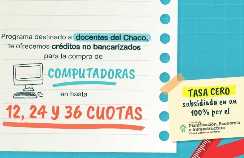 Desde el lunes 24 de abril las y los docentes que están ejerciendo su profesión podrán inscribirse a la línea de crédito a tasa cero del programa “Más Inclusión Docente Digital”, para la adquisición de computadoras. Se podrán solicitar créditos entre 150.000 y 350.000 mil pesos y la financiación podrá ser en 12, 24 o 36 cuotas. Esta gestión responde a una articulación entre el Ministerio de Planificación, Economía e Infraestructura en colaboración con Fiduciaria del Norte SA, el Nuevo Banco del Chaco y el Ministerio de Educación.