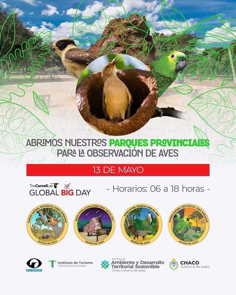 “Si sos observador de aves, fotógrafo o amante de la naturaleza, este sábado 13 de Mayo, te esperamos en el Parque Provincial Pampa del Indio, Parque Fuerte Esperanza, Parque Loro Hablador y Reserva Campo del Cielo para conocer y disfrutar de estos espacios naturales”, indicó el Instituto de Turismo.