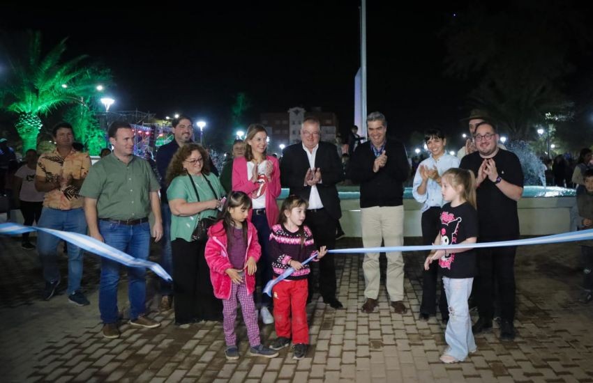 El gobernador Jorge Capitanich junto a la vicegobernadora Analía Rach Quiroga, y el intendente de Juan José Castelli, Pío Sander, inauguraron este lunes las obras de refacción integral y ampliación de la plaza San Martín de la localidad.