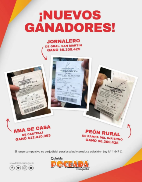 El otro ganador es un peón rural de Pampa del Infierno, que efectuó su apuesta en la Subagencia 556/03, ubicada en la intersección de Antártida Argentina y Paula Montal. Los números de la suerte en este caso fueron el 18, 32, 39, 64 y 74. Estos dos ganadores compartieron un premio mayor de $12.618.850 pesos, correspondiente a la edición de la Poceada del jueves 5 de octubre, por lo que cada uno de ellos se llevó una suma total de $6.309.425 pesos.