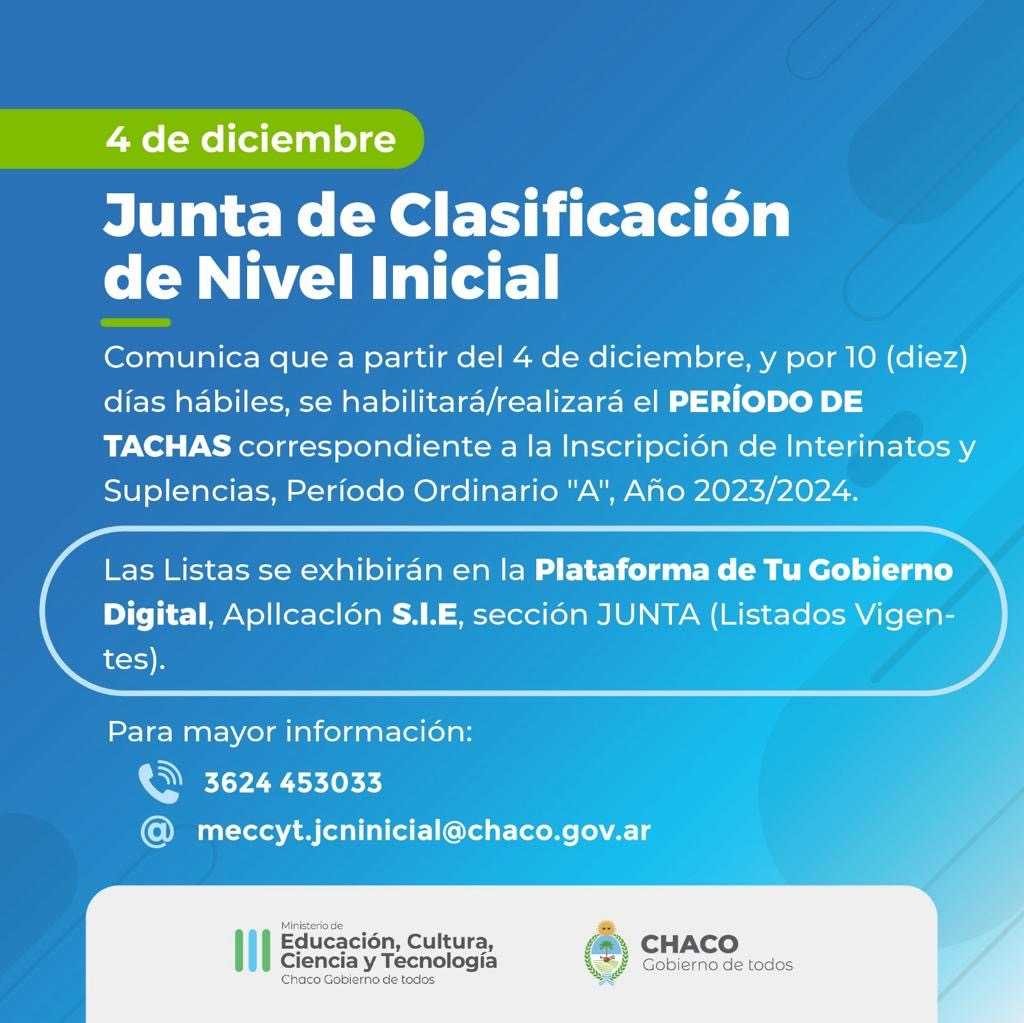 El Ministerio de Educación del Chaco, a través de la Junta de Clasificación de Nivel Inicial, comunica que a partir del 4 de diciembre, y por el término de 10 días hábiles, se realizará el período de tachas correspondiente a la inscripción de lnterinatos y Suplencias, Período Ordinario "A", Año 2023/2024.