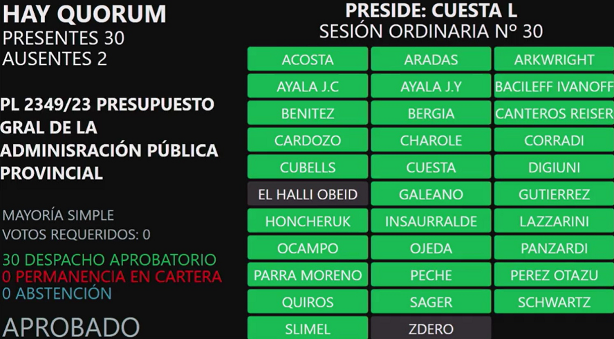 El primer proyecto abordado fue el 2349/23 que establece el Presupuesto General de la provincia para el 2024. La norma, que había sido remitida por el Poder Ejecutivo y sometida a una ronda de consultas con todos los sectores, fue avalada -en general- de forma unánime por los y las diputadas del oficialismo y de la oposición. Del total de 32 legisladores, estuvieron ausentes Leandro Zdero y Luis Alberto El Halli Obeid.