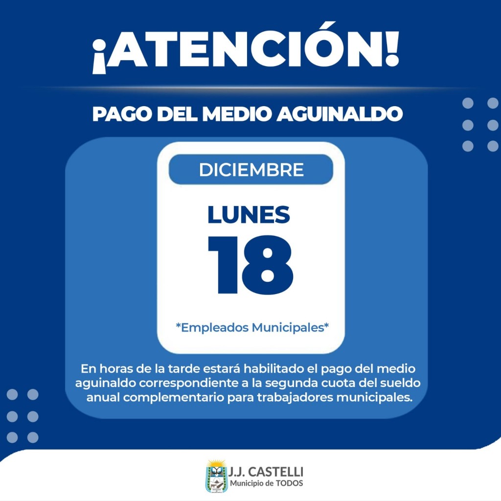 El intendente Pio Sander anunció que este lunes 18 de diciembre que desde esta tarde estará habilitado el pago del medio aguinaldo correspondiente a la segunda cuota del sueldo anual complementario para trabajadores municipales.
