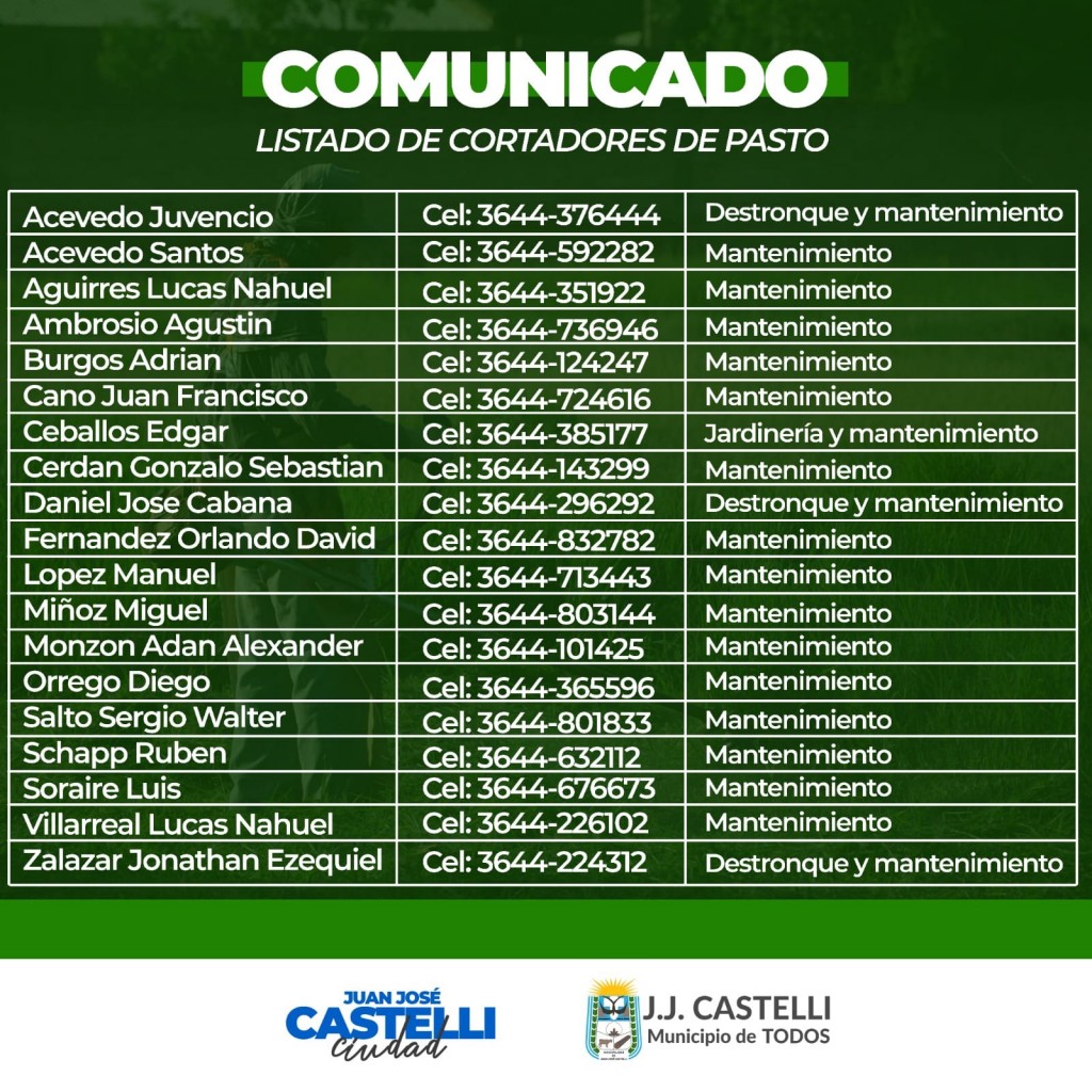 Desde la Municipalidad de Castelli presentaron un nómina de personas que prestan servicios de corte de pasto, desmalezado, destronque y otras tareas esenciales para mantener nuestra comunidad en las mejores condiciones.