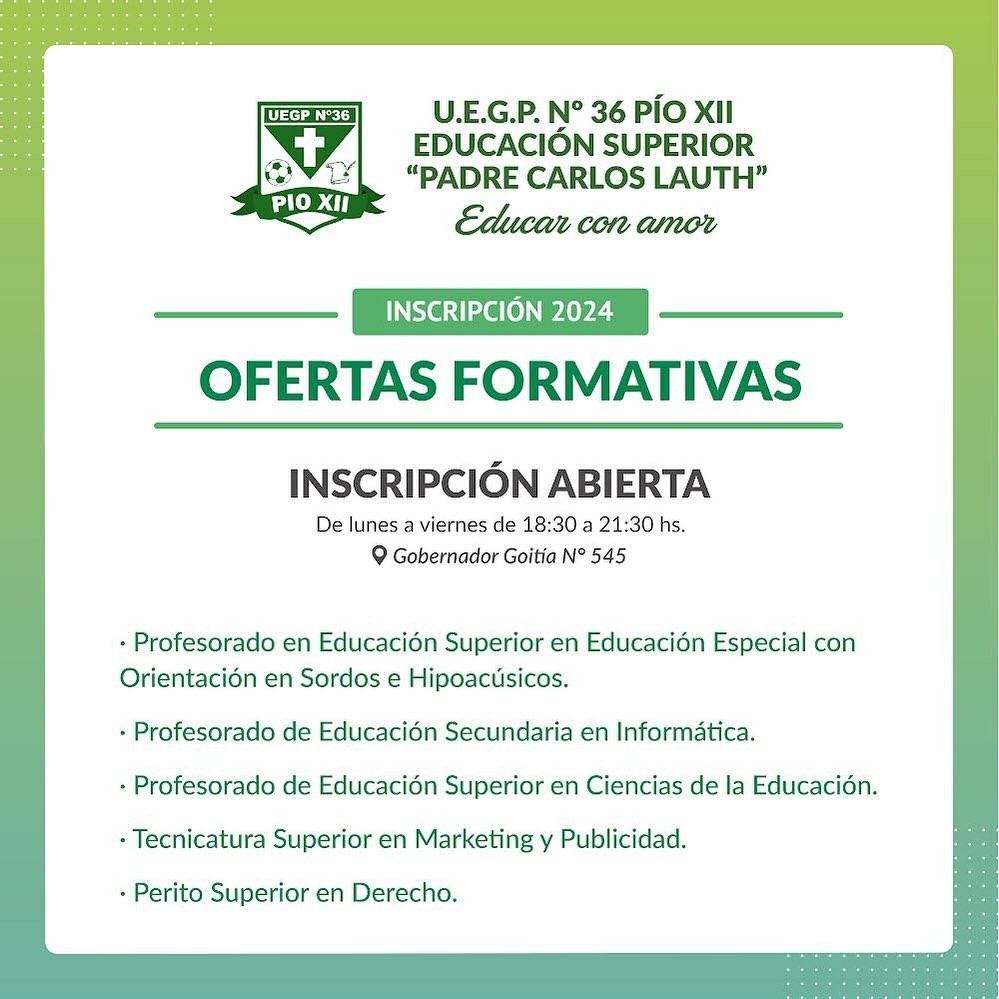 La U.E.P Nº 36 PIO XII, dio inicio a las inscripciones a las carreras terciarias perteneciente a la oferta académica 2024, que abarca profesorados, tecnicaturas y peritos.