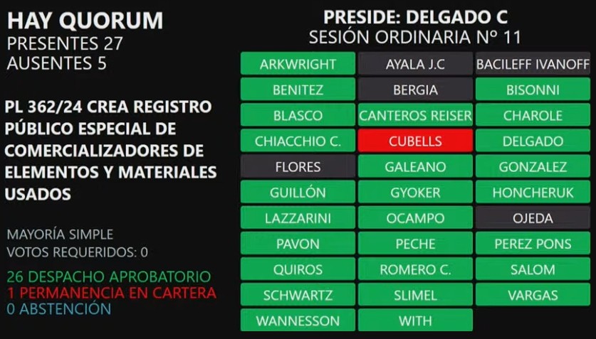 Con 26 votos afirmativos y un voto por su permanencia en cartera, la Legislatura provincial aprobó este miércoles la ley que crea el Registro Público Especial de Comercializadores de Elementos y Materiales Usados, en el que deberán inscribirse las personas físicas o jurídicas que realicen operaciones de compraventa de elementos y materiales usados, en forma permanente o eventual.