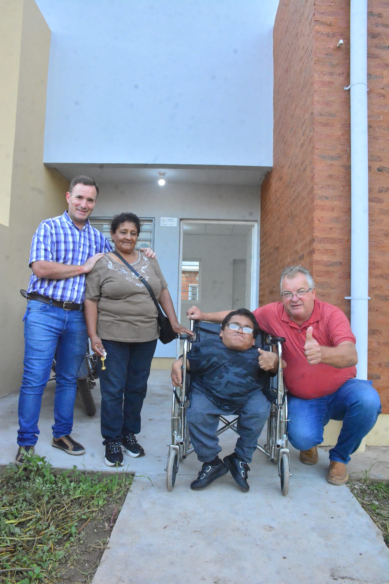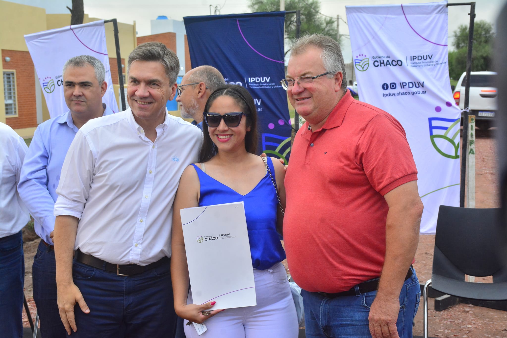Participaron también de la entrega de viviendas los vocales del IPDUV Diego Gutiérrez y Daniel Monti; la presidente del IPRODICH, Ana María Mitoire, el vocal de APA Luis Castagno y los Diputados provinciales Dorys Arkwright y Sebastian Lazzarini.