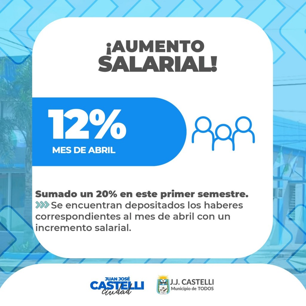Incrementamos los sueldos del empleado municipal, además de pagar en forma anticipada este 28 de abril, también incluimos un aumento del 12% para este mes de abril, acumulando y fijando así, en lo que va del primer semestre, un 20%."