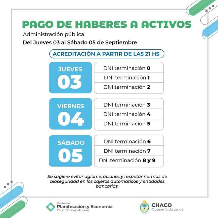 En tanto que el jueves 3 de septiembre comenzará el pago para el primer turno del sector activo, con DNI terminados en 0,1y 2; el viernes 4 a los que finalizan en 3, 4 y 5 y el sábado 5 concluirá el cronograma para los DNI que terminen en 6, 7, 8 y 9. En todos los casos también a partir de las 21.